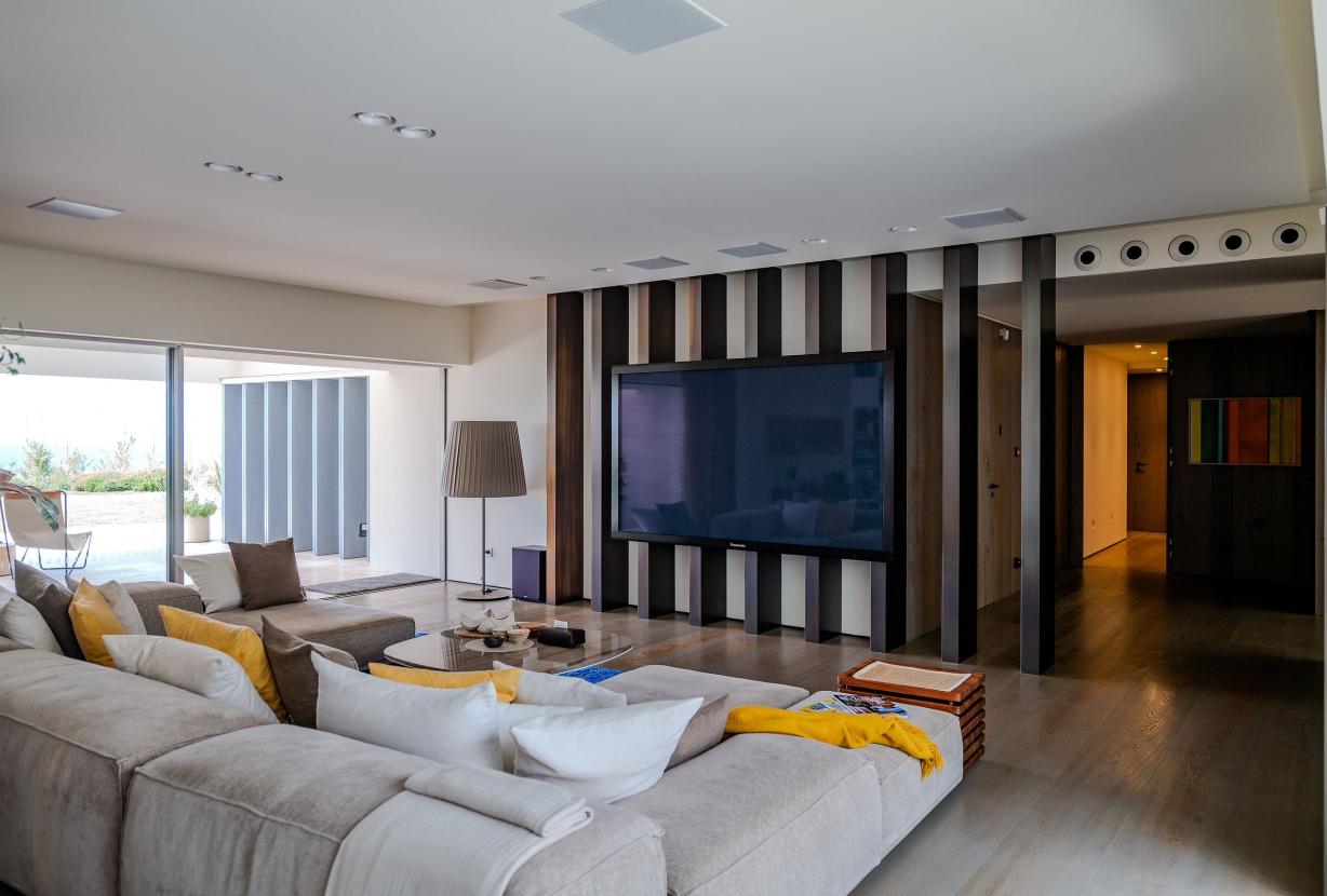 Inside, the villa exudes a serene Ibizan vibe with its cool, airy spaces dressed in warm, natural textures, neutral tones, and curated local art, embodying the island's laid-back essence. The heart of the villa, a spacious central patio, is encircled by three elegantly appointed living rooms and a dining room, all adorned in a chic Balearic style. Floor-to-ceiling windows retract seamlessly into the walls, merging indoor elegance with outdoor allure across various terraces, offering bars, serene chill-out areas, and open-air dining options.