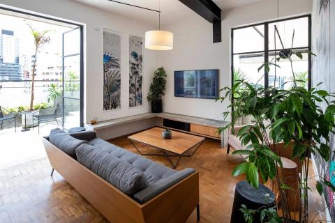 La propiedad de 103 m2 presenta un diseño contemporáneo y se mimetiza con el verdor de las plantas de la terraza, desde donde se tienen maravillosas vistas de la ciudad.