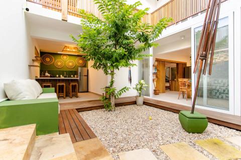 Cette suite spacieuse située au rez-de-chaussée combine une chambre à coucher et un espace de vie. Elle comprend deux lits doubles - l'un pour dormir et l'autre utilisé comme canapé pour la télévision - ainsi qu'un placard, une salle de bains privée et un jardin intérieur, garantissant confort et intégration à la nature.